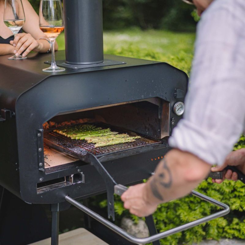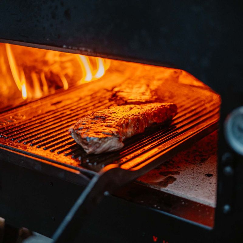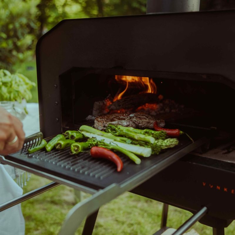 De op maat gemaakte Grill & Roast tool laat een nieuwe wind waaien in de barbecuewreld. Het easy-in/out schuifsysteem waar de grill in past zorgt voor een veilige en vlotte grillervaring. Als je geniet van een gegrild stuk vlees, gegrilde groenten of gamba's op een stokje, dan is dit zeker iets voor jou. De grill bevat een uitschuifbaar grillrooster met dubbelzijdige grillplaat die enorm veel mogelijkheden biedt: de platte kant als plancha voor coquilles en vis, en de kant met hét reliëf voor bijvoorbeeld stukjes vlees of asperges.Dankzij dit polyvalente barbecue- en grillrooster maak je de oven snel compatibel om te grillen, bakken en braden. Het grillrooster is geschikt voor de dubbelzijdige grillplaat. Bevestig de rek aan de uitschuifbare slider voor gemakkelijke verplaatsing. Gebruik het rek om hout aan de zijkant van de oven te stoken of verdeel kolen onder het rek. Het voordeel van dit systeem is dat je in een oven kunt grillen zonder dat er vloeistofresten van de gerechten in de houtskool druipen en onaangenaam vocht verspreiden. Het is ook een stuk gezonder: de rook van de houtskool dringt niet door het eten terwijl we grillen onder de vlam en op een hete en afgesloten grillplaat. Houtgeur? Geen zorgen, dat zal er nog steeds zijn! Dit pakket is compatibel met Vonken Home en Vonken Original.
