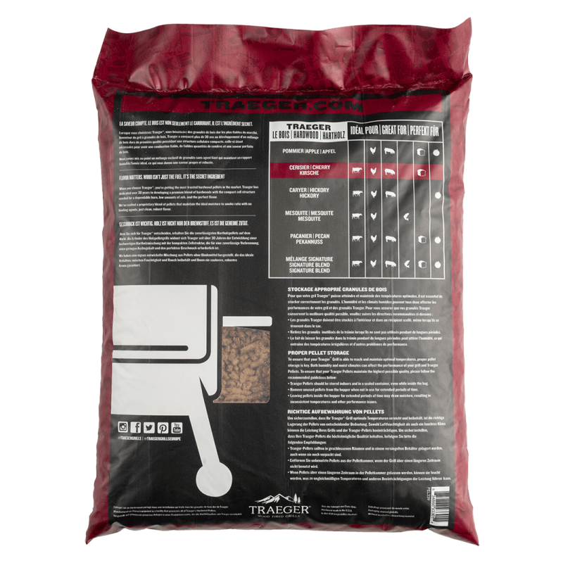 De Traeger kersen hout BBQ pellets zijn gemaakt van 100% natuurlijk hardhout en hebben een food grade kwaliteit. Ze zorgen voor de perfecte verbranding en een optimale houtgestookte smaak. Deze pellets worden geproduceerd in de Verenigde Staten, in eigen Traeger fabrieken, en bieden eindeloze smaakcombinaties. Elke zak bevat 9,07 kg.