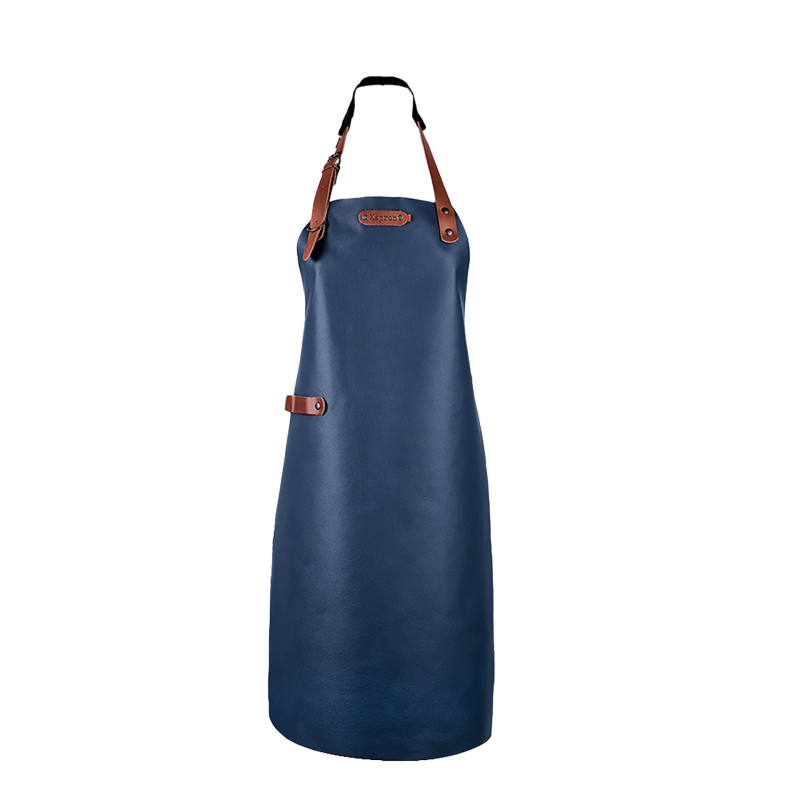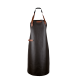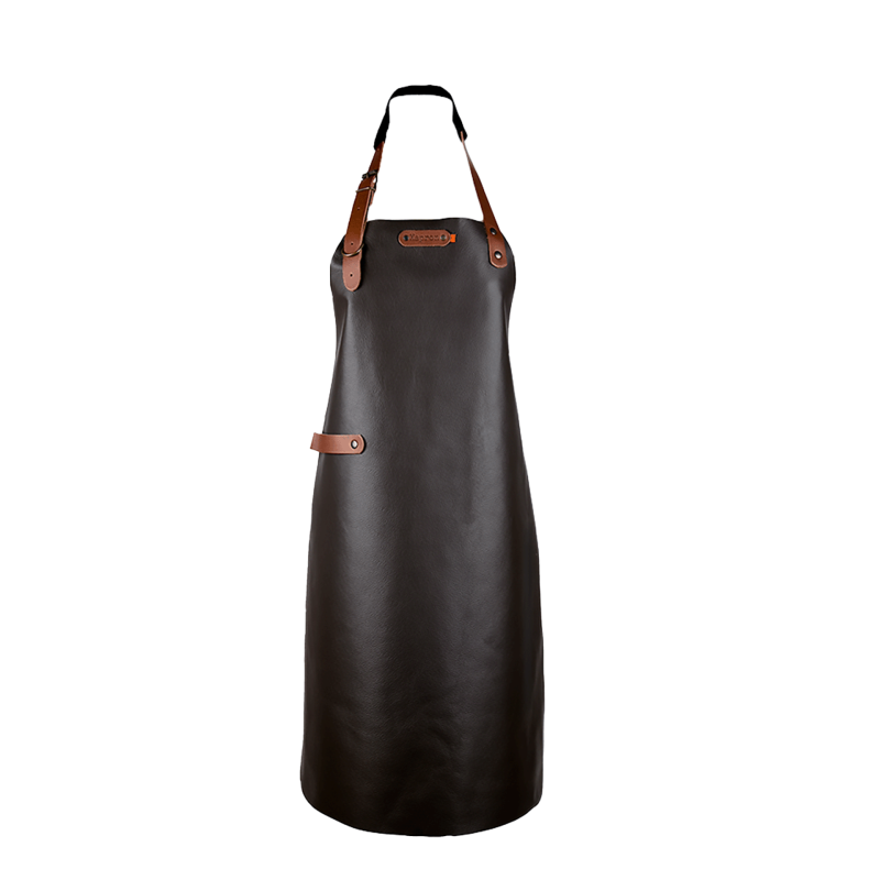 De nekbandconstructie zorgt voor een stabiele en toegankelijke pasvorm. De leren banden zijn geolied en gepolijst en afgewerkt met volledig messing gespen, waardoor het schort eenvoudig verstelbaar is en goed aansluit tijdens het koken.