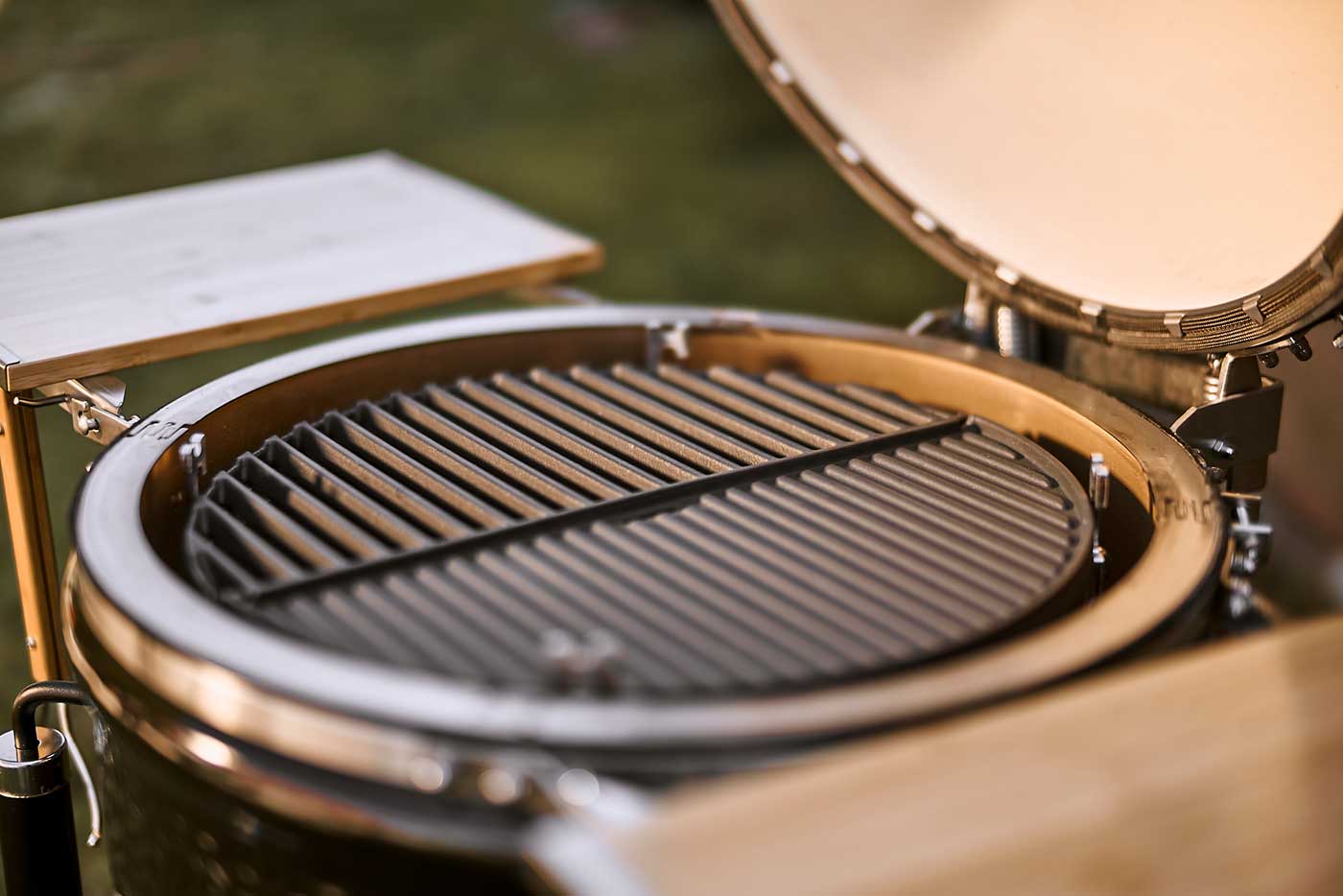 Combineer de plancha met een roestvrijstalen rooster of een gietijzeren rooster om twee kookzones te creëren: grillen én bakken tegelijk. Dankzij het halfronde ontwerp wissel je flexibel tussen directe en indirecte bereidingen.