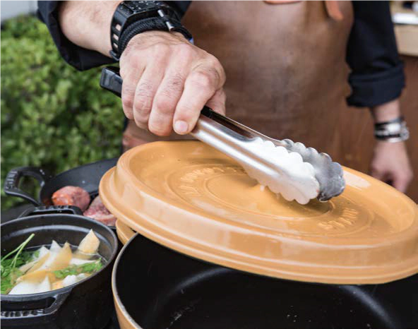 De tang is vervaardigd van roestvrij staal en afgewerkt in matzwart. Dankzij het ergonomische ontwerp ligt hij prettig in de hand, ook bij langere bereidingen.