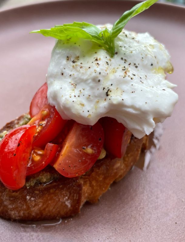 Bruschetta met tomaat, pesto en gerookte burrata