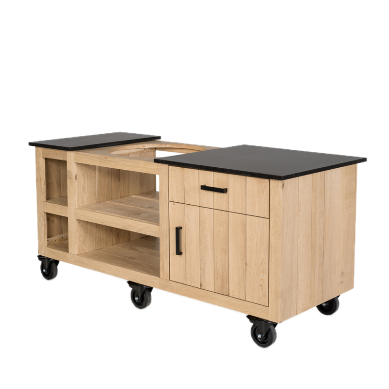 De tafel is standaard uitgevoerd met mat zwarte handgrepen en 4 zwenkwielen, zodat deze gemakkelijk te verrijden is naar de gewenste plek. Wil je het meubel extra beschermen tegen UV-straling en vocht? Dan is er een afdekhoes beschikbaar, welke de complete set netjes afdekt. Deze is optioneel bij te bestellen. Daarnaast kan deze buitenkeuken besteld worden met doorlopend Granieten werkblad en in een XL variant.