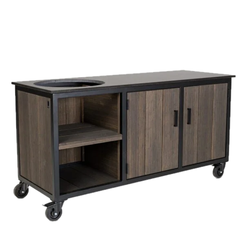 De kamado buitenkeuken Bamboe Graphite Inferno is een uiterst functioneel opbergmeubel met een zwart gepoedercoat stalen frame, ontworpen om het hele jaar door buiten te gebruiken. De houten inleg is gemaakt van duurzaam Bamboe Graphite. Het werkblad van composiet voegt een vleugje luxe toe aan het meubel en is eenvoudig schoon te maken. Bovendien is composiet krasbestendig en bestand tegen hoge temperaturen.