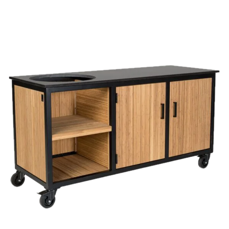 De kamado buitenkeuken Bamboe Naturel Inferno is een uiterst functioneel opbergmeubel met een zwart gepoedercoat stalen frame, ontworpen om het hele jaar door buiten te gebruiken. De houten inleg is gemaakt van duurzaam Bamboe Naturel. Het werkblad van composiet voegt een vleugje luxe toe aan het meubel en is eenvoudig schoon te maken. Bovendien is composiet krasbestendig en bestand tegen hoge temperaturen.