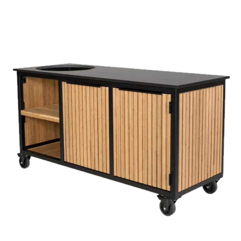De buitenkeuken Bamboe Naturel Rhombus Inferno is een uiterst functioneel opbergmeubel met een zwart gepoedercoat stalen frame, ontworpen om het hele jaar door buiten te gebruiken. De houten inleg is gemaakt van duurzaam Bamboe Naturel. Het werkblad van composiet voegt een vleugje luxe toe aan het meubel en is eenvoudig schoon te maken. Bovendien is composiet krasbestendig en bestand tegen hoge temperaturen.