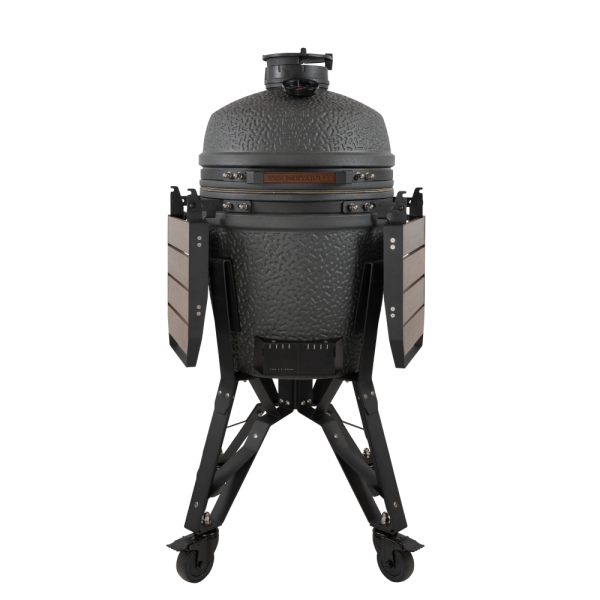 De Junior wordt geleverd met een stevig onderstel, waardoor je hem direct op een veilige hoogte kunt gebruiken. Het is mogelijk om de kamado uit te breiden met accessoires zoals een verhoogd rooster, een gietijzeren rooster of een pizzasteen, zodat je eenvoudig meerdere gerechten tegelijk kunt bereiden.