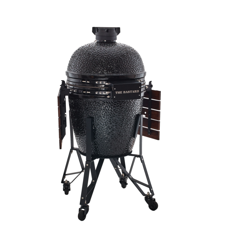 Deze robuuste, matzwarte Bastard Large kamado combineert stijl, prestaties en gebruiksgemak in één krachtige buitenkeuken. Dankzij de cordieriet keramische behuizing houdt The Bastard warmte perfect vast en regel je de temperatuur met precisie via de gietijzeren topschijf en onderste luchtinlaat. Het resultaat: een stabiele, gecontroleerde verbranding voor elk gerecht — of je nu grilt, rookt, bakt of slowcooked bereidt.