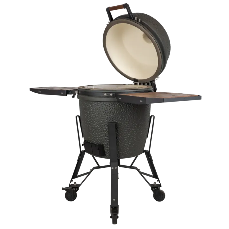 - Volledige set: inclusief rooster, plate setter, kolenmand en onderstel met zwenkwielen.