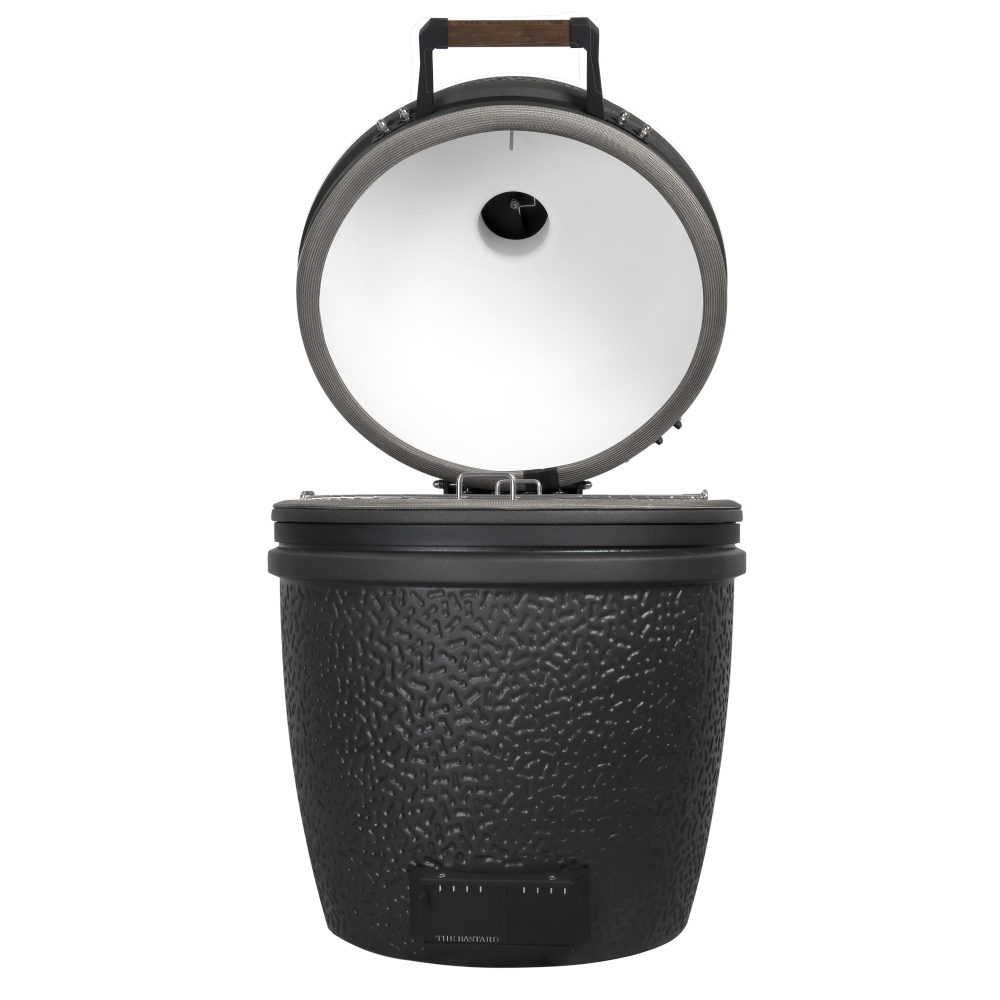 Het versterkte scharnier van het deksel zorgt voor minder krachtsinspanning bij het openen en gaat jarenlang mee dankzij de enorme draagkracht van de veren. Aangezien het Solo-model niet voorzien is van een onderstel of zijtafels, is het aan te raden om een geschikte ondergrond te kiezen om de barbecue op te zetten. Ook kun je overwegen een barbecue-meubel aan te schaffen, zoals ‘The Bastard Outdoor kitchen basic’ of ‘The Kamado transporter’, beide geschikt voor The Bastard Large-modellen.